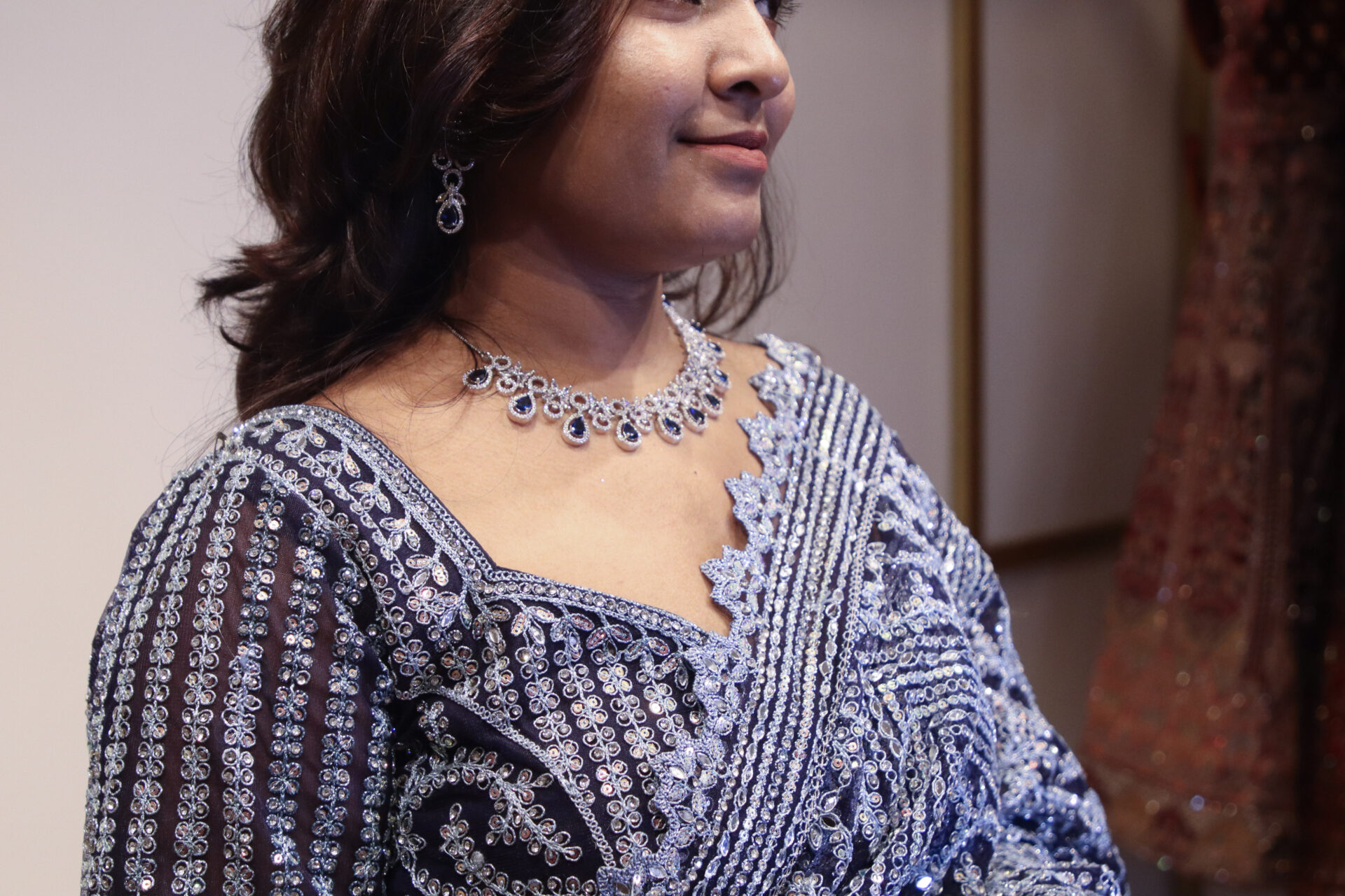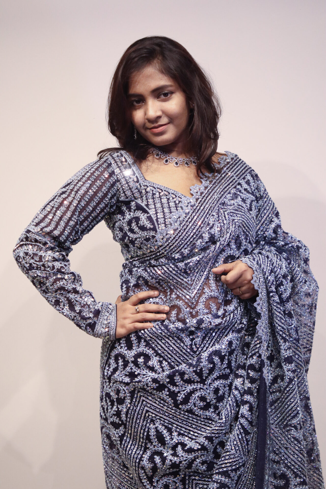 This midnight blue Designer saree is a striking blend of elegance and glamour, crafted to make a statement at evening celebrations and special occasions. The saree features dense all over embroidery with intricate geometric and floral motifs, highlighted by shimmering crystal and sequin detailing that catches the light beautifully with every movement. The blouse complements the saree with matching embroidery, sheer sleeves, and a refined neckline that enhances the overall silhouette. Draping gracefully, this saree offers a perfect balance of sophistication and modern charm, making it an ideal choice for women who want a bold yet graceful presence.